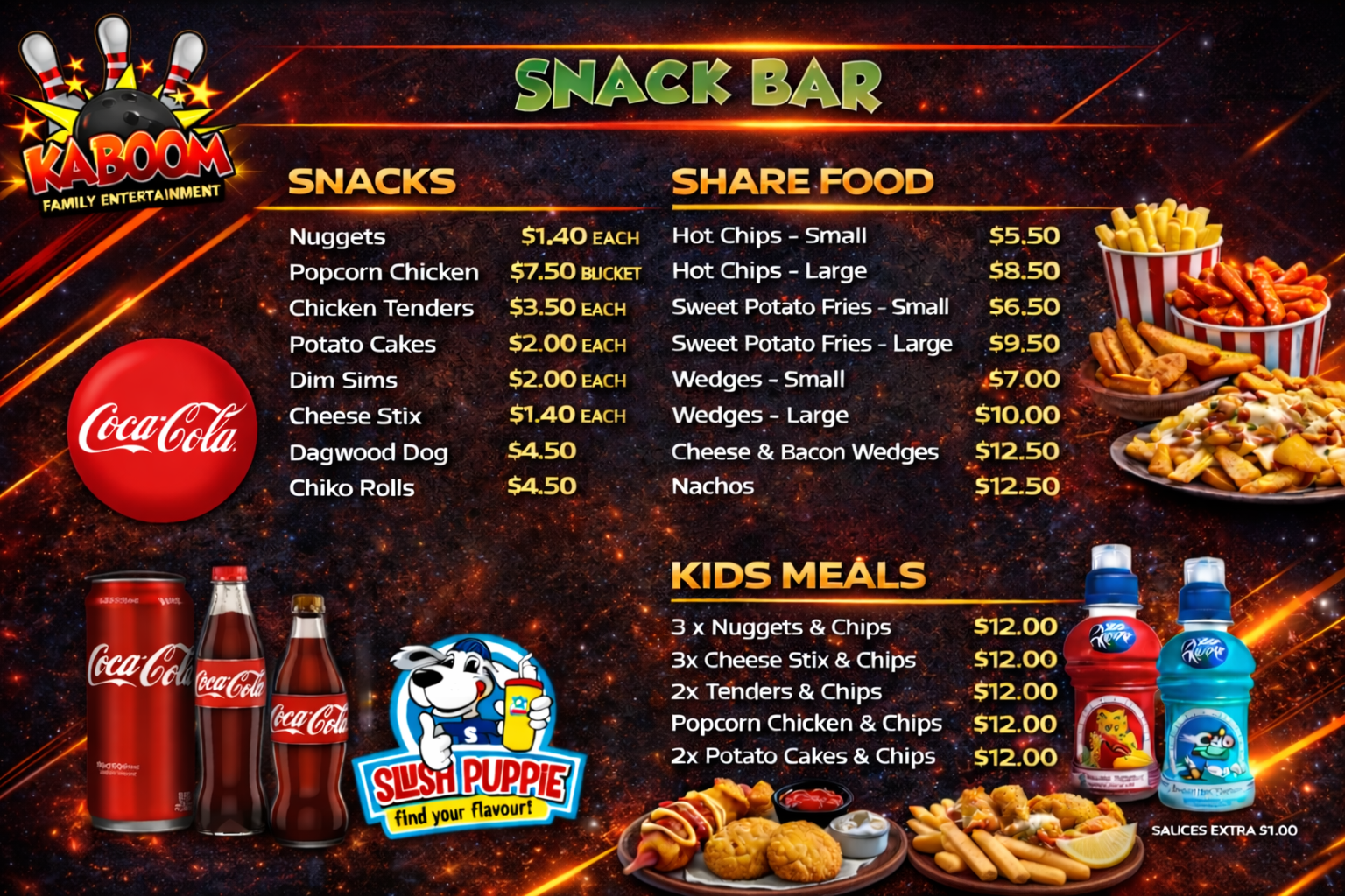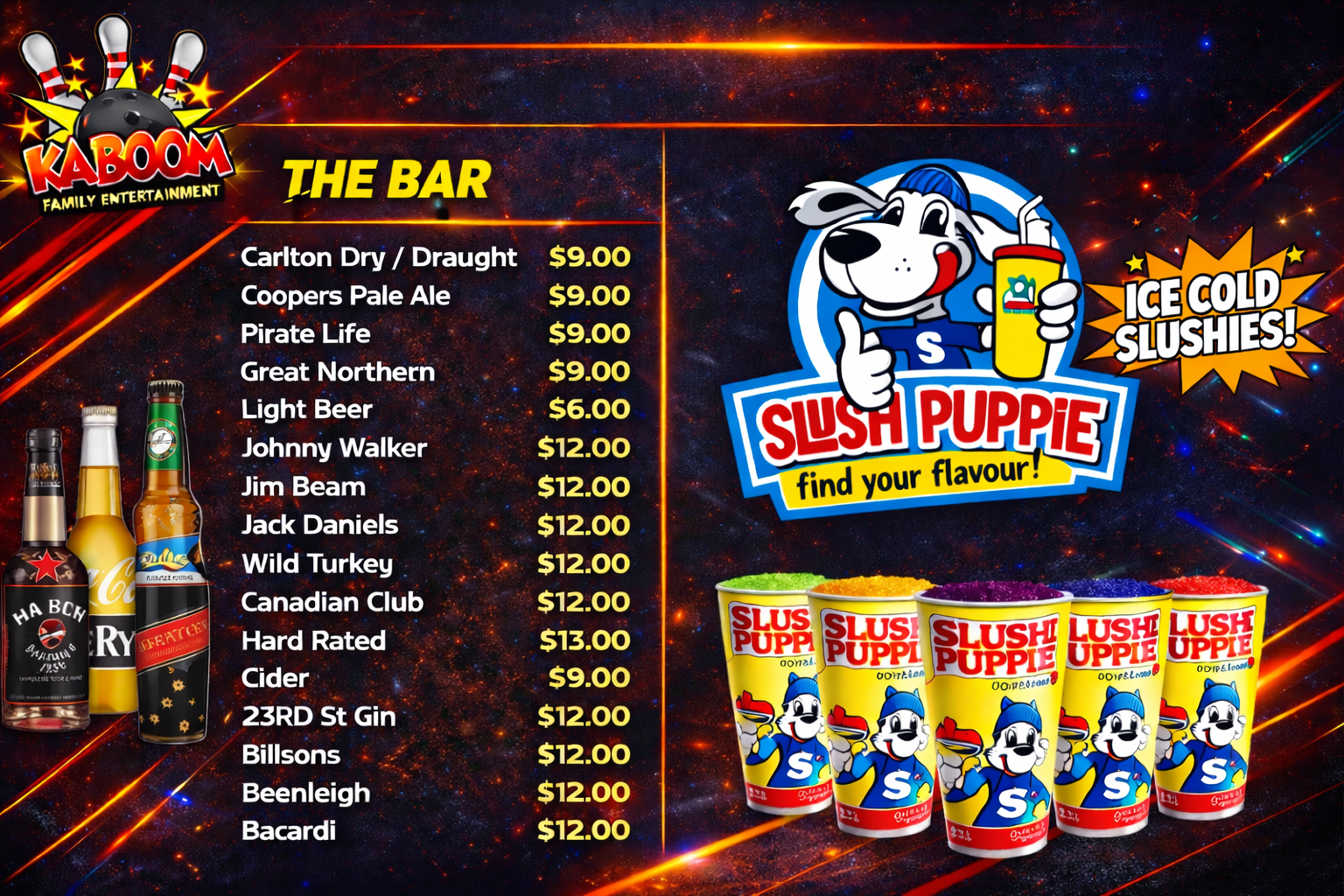 Elevate your bowling night at Kaboom with a visit to The Snack Bar – your go-to destination for delectable delights and refreshing beverages!